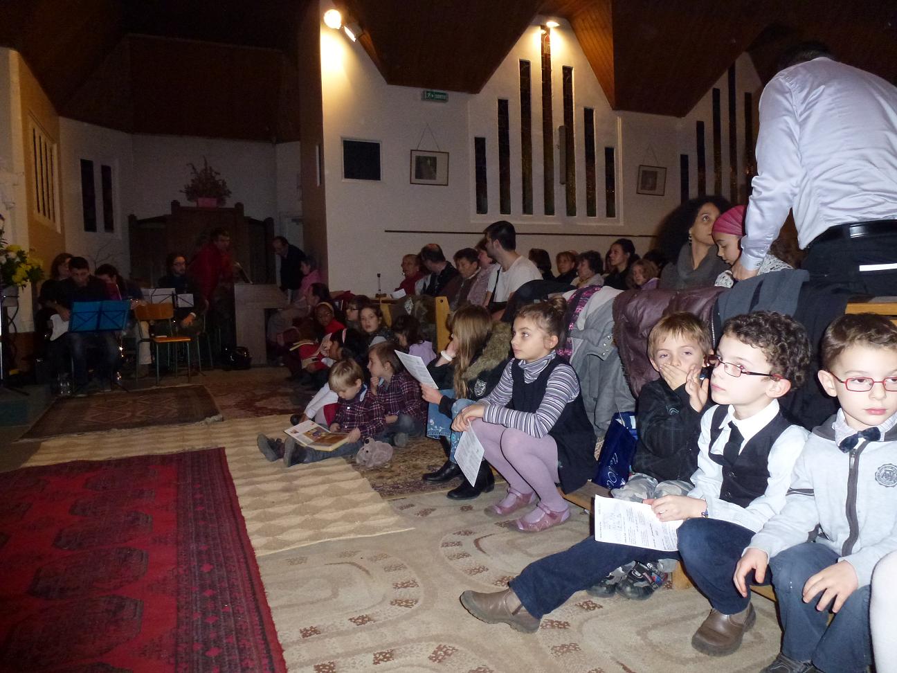 Les enfants devant l'autel et la crèche